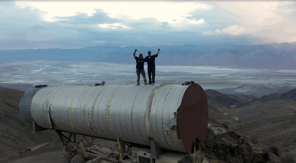 Diesel Dave and Brent Underwood atop a water tank 11×47 feet long and 25,000lbs as it ascends to Cerro Gordo via YouTube.